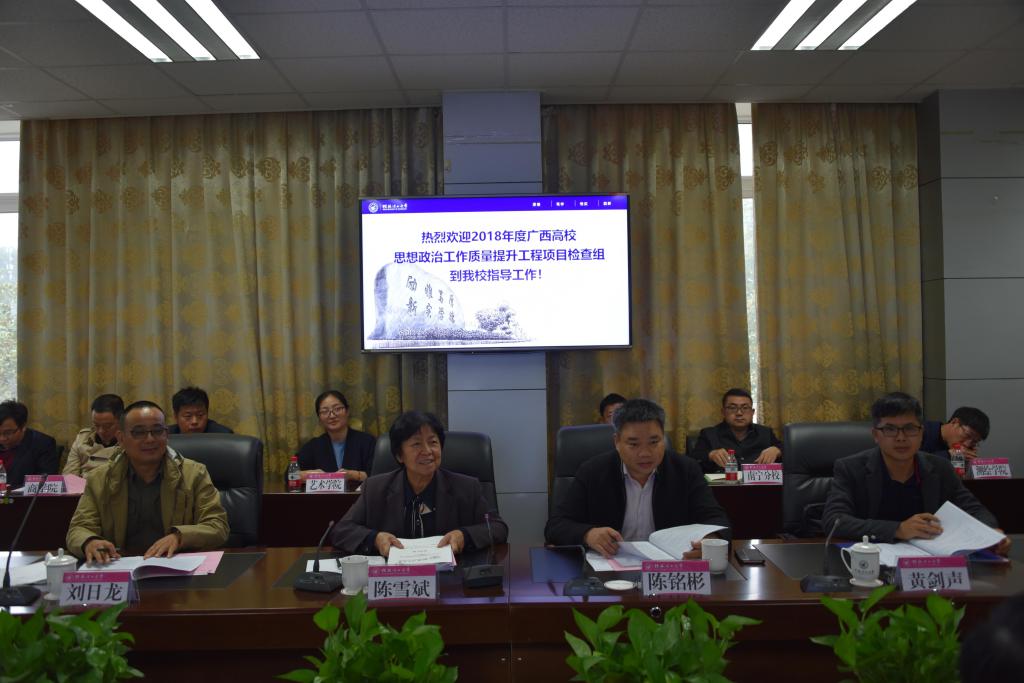 11月12日下午,由广西中医药大学副厅级调研员陈雪斌为组长的2018年广西高校思想政治工作质量提升工程项目检查组一行莅临我校对我校“三全育人”示范校项目进行检查指导。检查汇报会在雁山校区行知楼A201会议室召开,校党委书记李国忠、党委副书记王赣华出席会议,党(校)办、组织部、宣传部、纪委办、学工部、研工部、校团委、教务处、科技处、人事处、财务处、国交处、保卫处、基建后勤处、后勤集团、离退处、现教中心、图书馆、人文素质教学部、校医院等单位和部门主要负责人;马克思主义学院院长以及各二级学院党委书记参加会议,会议由党委副书记王赣华主持。