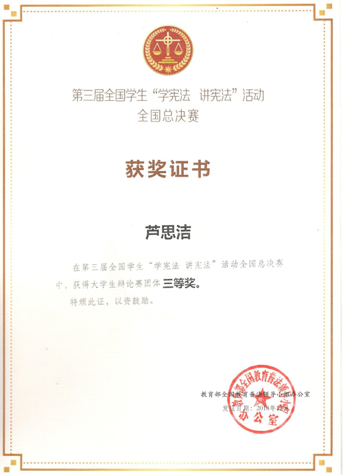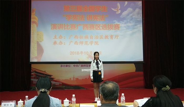 近日,由教育部主办的第三届全国学生“学宪法讲宪法”活动暨全国总决赛落下帷幕。来自全国31个省(区、市)、新疆生产建设兵团和香港、澳门特别行政区的34支地区队伍展开了激烈的角逐,由谷正杰、吴田波老师指导的地球科学学院学子芦思洁经过校赛、广西区选拔赛,以广西区总成绩第二的好成绩脱颖而出,代表我校晋级广西代表队参加全国总决赛,并最终斩获大学生辩论赛团体三等奖。