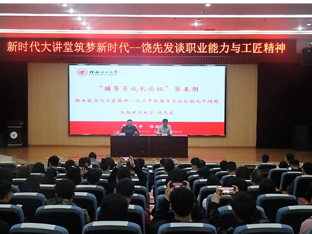为进一步加强我校辅导员队伍职业化、专业化建设,提升辅导员队伍素质能力,3月20日上午,学校在雁山校区图书馆报告厅举办了我校第五期“辅导员成长论坛”。全国优秀辅导员、英国雷丁大学学生事务管理访问学者、全国学校共青团研究中心特聘副研究员、中国大学生在线就业创业导师、中国高等教育学会学生工作分会理事、江西教育网特约评论员、江西理工大学饶先发老师应邀为我校全体辅导员作了题为“职业能力与工匠精神——谈谈年轻辅导员成长的几个问题”专题报告。学工系统全体专兼职辅导员、博文管理学院辅导员代表及学工处相关负责人共计100余人参加本次论坛。