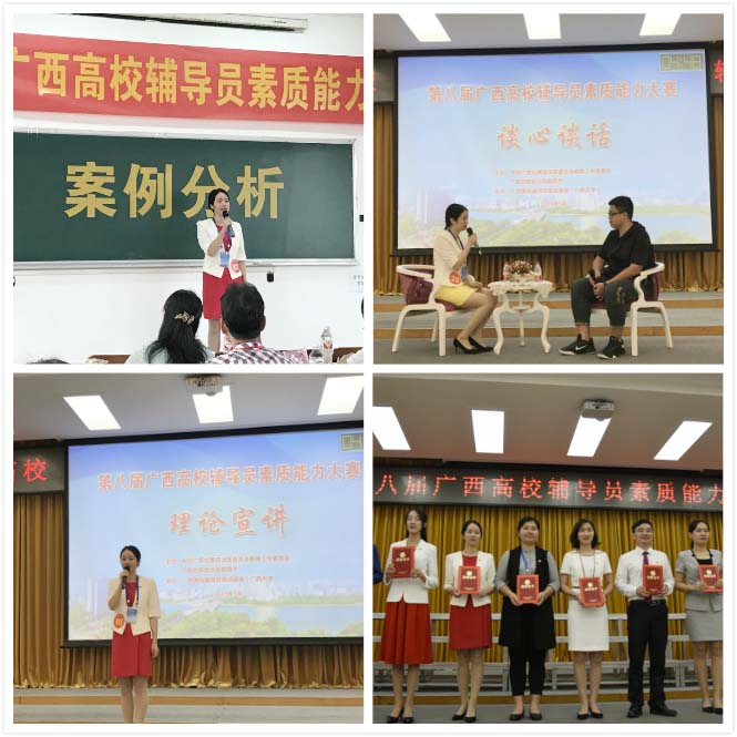 据悉,该赛事是广西区内高校辅导员系统最高层次的素质能力竞赛平台,不仅是对辅导员理论水平和实践能力的全面检验,也是对辅导员的综合素质能力的全面考察。近年来,学校深入贯彻落实教育部和广西区关于加强辅导员队伍建设的工作要求,高度重视辅导员队伍建设,通过举办学校辅导员职业能力大赛、大力支持辅导员工作室建设、成立辅导员科研团队、强化培训体系建设、实现辅导员职称定级,定期举办辅导员成长论坛等举措不断为辅导员搭建高水平的学习交流平台,多途径系统推进辅导员素质能力提升。未来,我校学工部将进一步健全辅导员队伍建设的平台载体与制度机制,全面提高辅导员队伍的专业化职业化水平与大学生思政教育工作实效,努力为学校“双一流”建设和人才培养贡献新的更大力量。