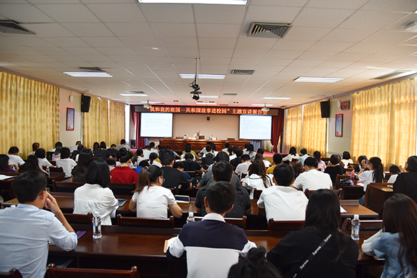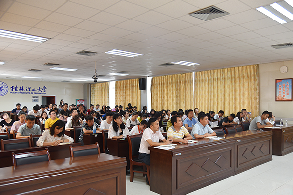 为庆祝新中国成立70周年,讲好中国故事,讲好中国共产党故事,进一步激发青年学生的爱国之情,强化爱国之志,扎实推进“不忘初心、牢记使命”主题教育,9月24日下午,“我和我的祖国——共和国故事进校园”百场主题宣讲活动在我校雁山校区行知楼A406会议室开展。广西师范大学马克思主义学院院长、博士生导师汤志华教授为我校师生作《从百年党史看党的初心和使命》主题宣讲报告,我校各学院党委副书记、辅导员、学生代表等百余名师生到场聆听。宣讲报告会由学校党委宣传部部长叶昊主持。