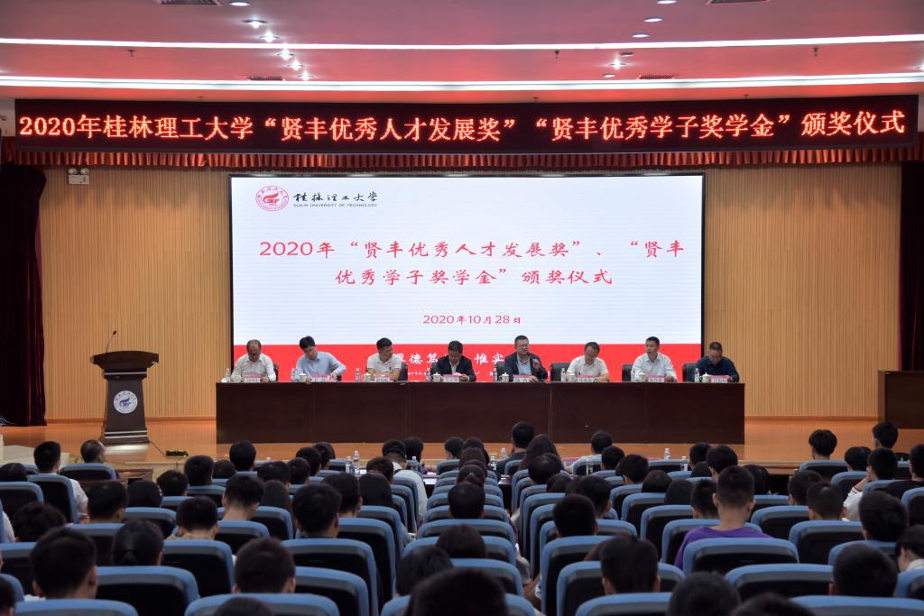 10月28日上午,我校2020年“贤丰优秀人才发展奖”、“贤丰优秀学子奖学金”颁奖仪式在雁山校区图书馆报告厅举行。学校党委副书记吴志强、贤丰控股集团总裁助理兼总裁办主任陆酉、贤丰控股集团全南县官山钨业有限公司副总经理谢锦航出席仪式。学校党(校)办、校友办、学工处、科技处、招就处、研究生院相关负责人,相关学院党委副书记、辅导员代表、学生代表和全体获奖人员参与仪式。