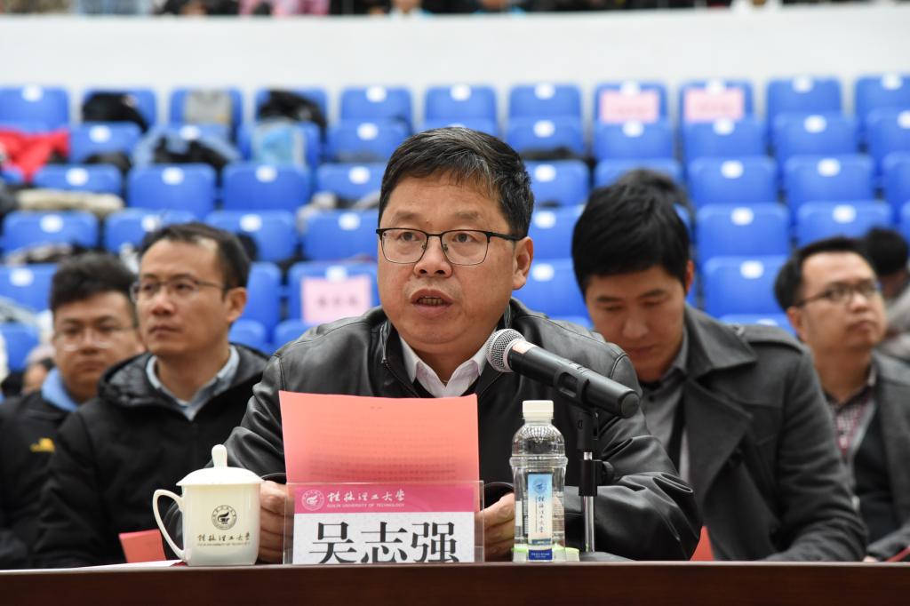 吴志强作赛前讲话。他表示,学校高度重视体育健康教育,倡导开展体育健身类校园文化活动,广播体操作为学校传统群众性体育活动和“三早一晚”的重要组成部分,对学校学风建设和体育教育具有重要意义。吴志强向广大学生发出倡议,希望同学们以广播操比赛为契机,发扬团结一致、奋发向上的精神,展现桂工学子的良好精神风貌;希望同学们积极参与各类体育锻炼活动,以阳光、健康、向上的风貌和顽强拼搏的体育精神投入到日常的工作、学习、生活中,真正把自己培养成德智体美劳全面发展的社会主义建设者和接班人。