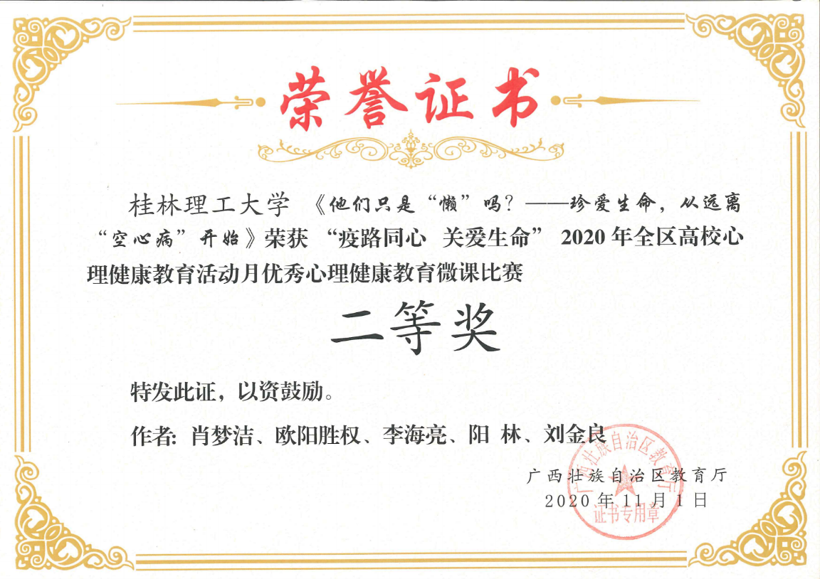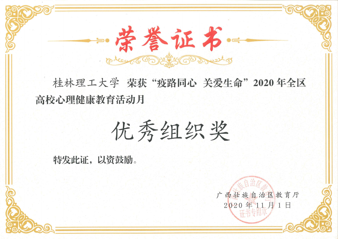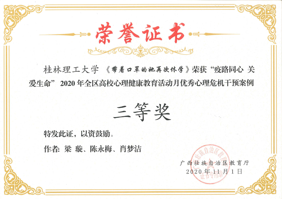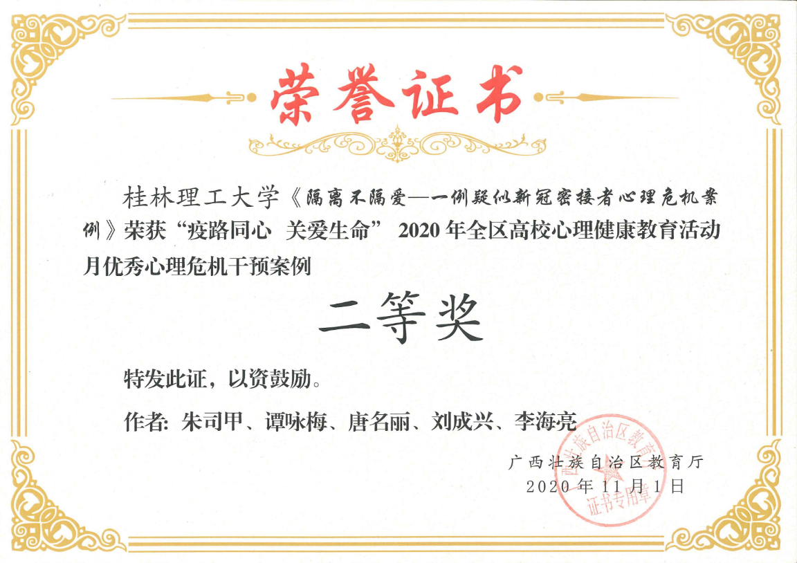 朱司甲老师主写的心理危机案例《隔离不隔爱一一例疑似新冠密接者心理危机案例》获得心理危机干预案例比赛二等奖,梁璇老师主写的心理危机案例《带着口罩的她再次休学 》获得心理危机干预案例比赛三等奖。我校荣获2020年全区高校心理健康教育活动月“优秀组织奖”。