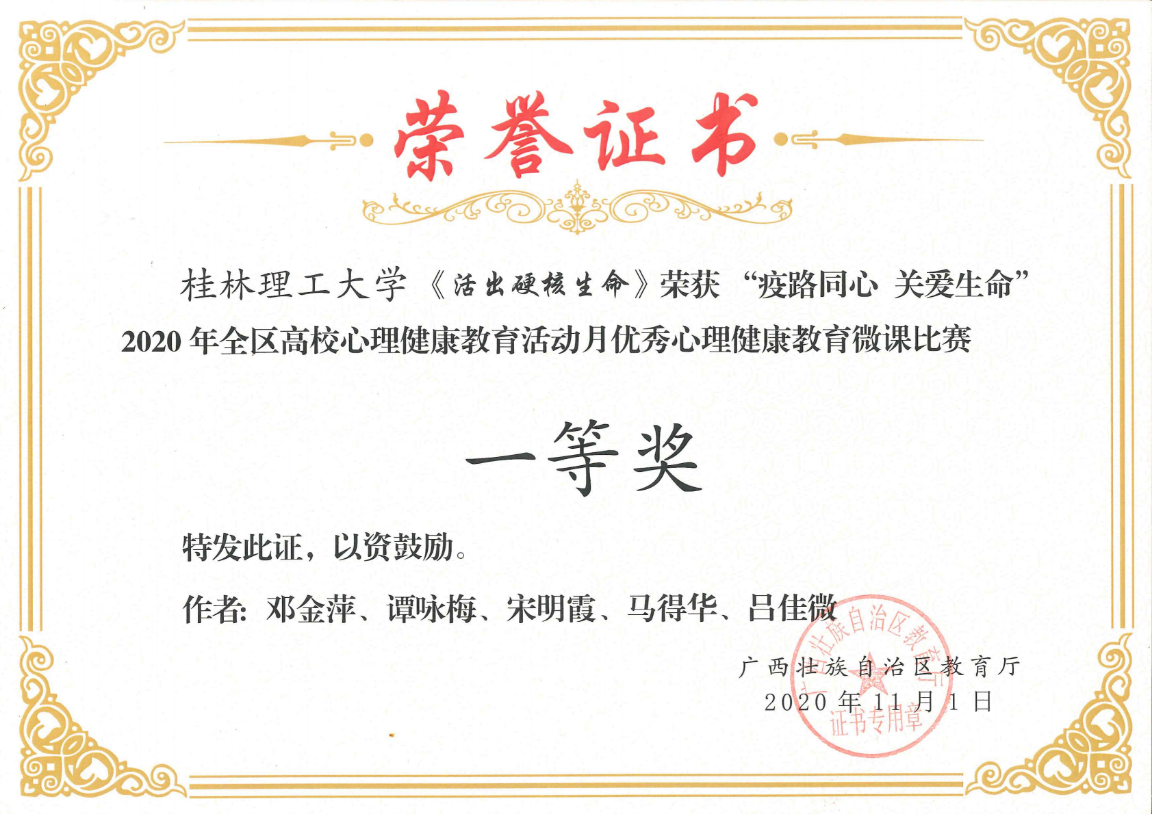 我校在2020年全区高校大学生5.25心理健康教育活动月主题活动中取得优异成绩。邓金萍老师主讲的微课《活出硬核生命》获得心理健康教育微课比赛一等奖,肖梦洁老师主讲的微课《他们只是“懒” 吗?——珍爱生命,从远离“空心病”开始》获得心理健康教育微课比赛二等奖。