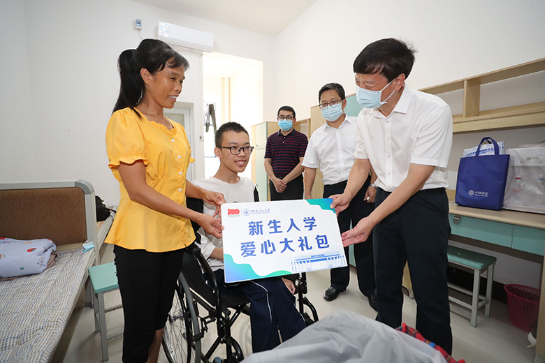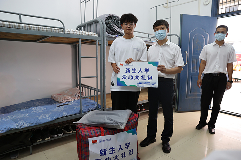 校领导一行随后走进二号组团18栋、24栋学生公寓,检查新生宿舍配套设施、用电安全、环境卫生等情况,听取各学院迎新工作、宿舍管理、班主任走访等情况。在学生宿舍,校领导看望慰问了来自桂林恭城的陈明辉同学,为他送上“新生开学大礼包”。陈同学是今年录取到我校商学院工商管理专业的新生,因肌肉萎缩而导致行动不便,为帮助他顺利完成学业,学校为其分配并改造单独的宿舍,便于母亲来校陪读。解庆林对陈明辉同学自强不息的精神给予高度赞许,并嘱咐他有困难及时向学校反映,学校将全力提供帮助,希望他继续保持积极向上的心态,用心钻研所热爱的专业,靠自己的努力奋斗创造美好人生。校领导还看望慰问了河南籍受灾致困的李一枫同学及同宿舍新生,详细询问了他们籍贯、专业等情况,勉励他们珍惜宝贵的学习机会和难得的大学时光,尽快适应新环境,积极融入大学生活。