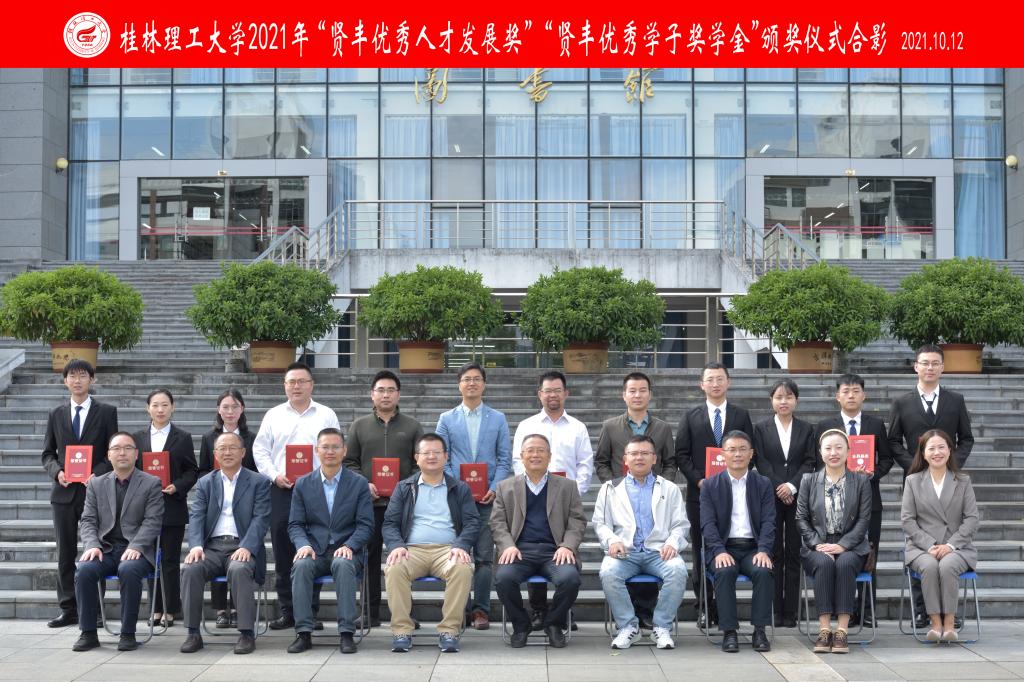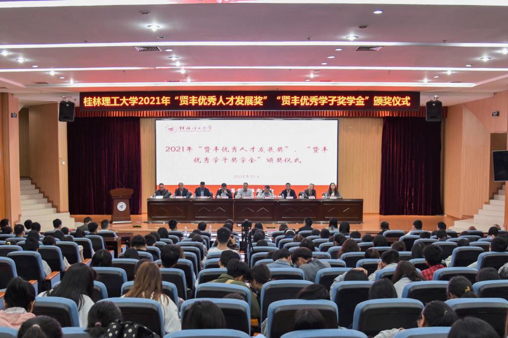 10月12日上午,我校2021年“贤丰优秀人才发展奖”“贤丰优秀学子奖学金”颁奖仪式在雁山校区图书馆报告厅举行。学校党委常委、副校长王敦球、贤丰控股集团有限公司总经理余文凯和总裁助理兼总裁办主任陆酉出席仪式。学校党(校) 办、校友办、人事处、学工处、科技处、招就处、研究生院相关负责人,相关学院党委副书记、辅导员代表、学生代表和全体获奖人员参加仪式。