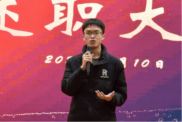 机械控制与工程学院易班学生代表邓柳旭发言。他在发言中分享了学院易班发展建设中取得优异成绩的经验,并指出在工作中存在的问题与不足,期待在学校易班发展中心和学院的指导下,把易班发展建设得更好。