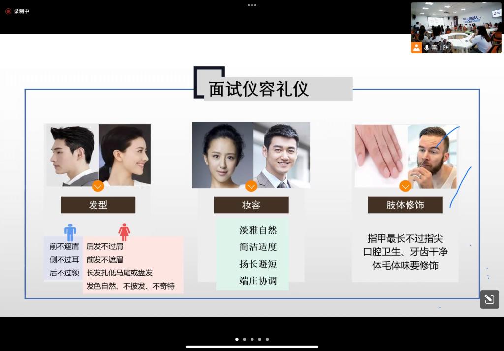 接着,她从仪容礼仪、仪态礼仪、服饰礼仪三方面生动诠释了职场面试礼仪技巧及注意事项。她指出,职场面试要把握好着装得体、妆容淡雅、仪态端庄、举止文雅等原则,强调礼仪非一日之功,鼓励学员们要从自我做起,从细节做起,充分练习,做一个知书达礼的人。
