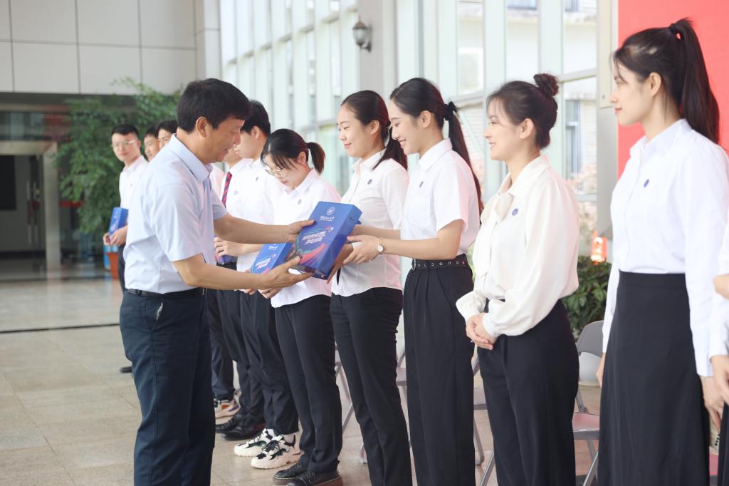 会后,解庆林为毕业生代表赠送毕业纪念品,并进行合影留念。
