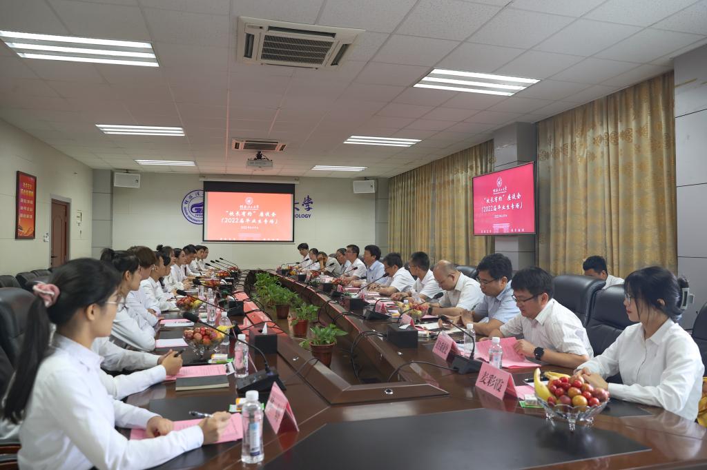 为广泛凝聚广大毕业生的智慧和力量,构建高质量人才培养体系,6月9日上午,我校在雁山校区行知楼A201会议室举行“校长有约”(2022届毕业生专场)座谈会。学校校长解庆林、党委副书记吴志强,党办校办、学工处、教务处、研究生院、校团委、招生就业处、后勤集团等部门负责人及来自各学院的2022届毕业生代表出席和参加了本次座谈会。