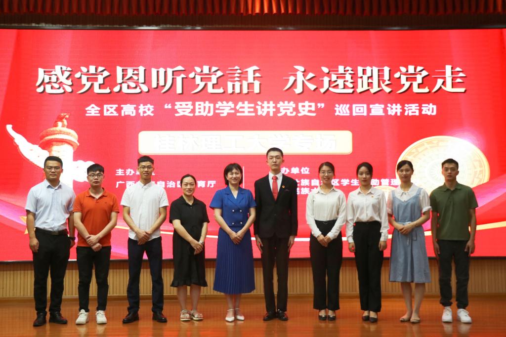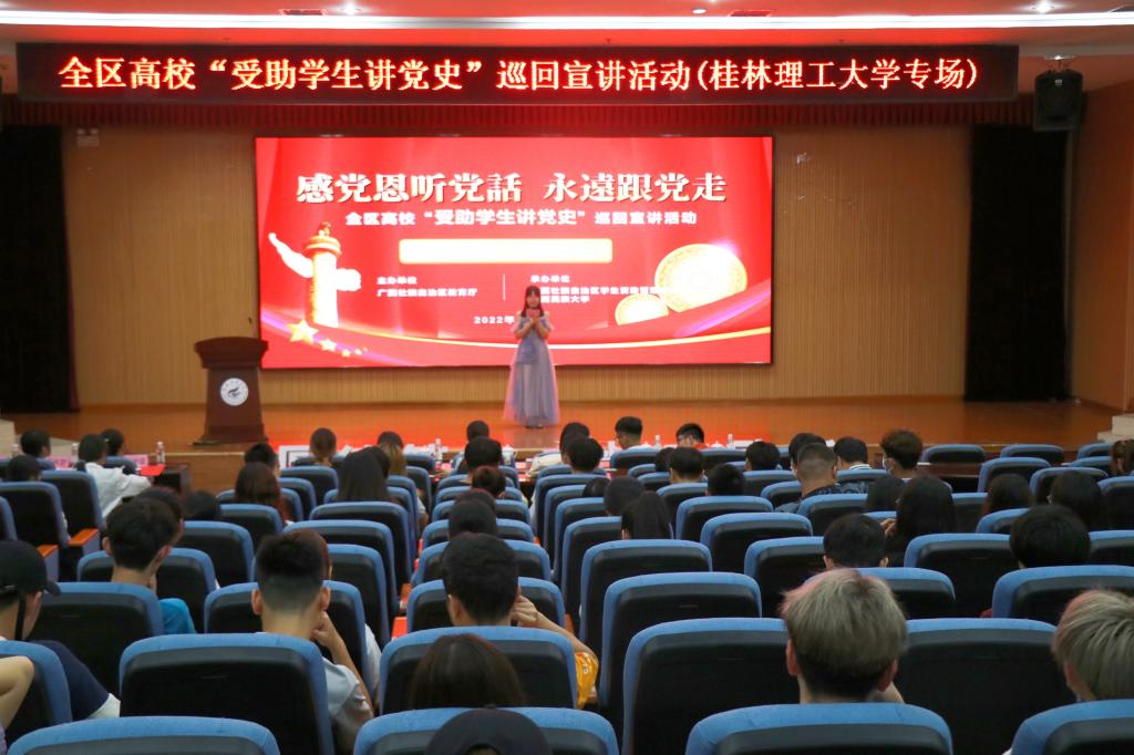为深入学习贯彻习近平总书记在庆祝中国共产党成立100周年大会上的重要讲话精神,进一步创新资助育人方式,深入推进受助学生党史学习教育不断走深走实,6月21日上午,我校在雁山校区图书馆报告厅举办全区高校“受助学生讲党史”巡回宣讲活动。学校学生工作部(处)副部(处)长孙巍出席本次活动并致辞,巡回宣讲团指导老师及宣讲成员、学生资助工作办公室全体干部、受助学生代表共计200余人参加此次活动。