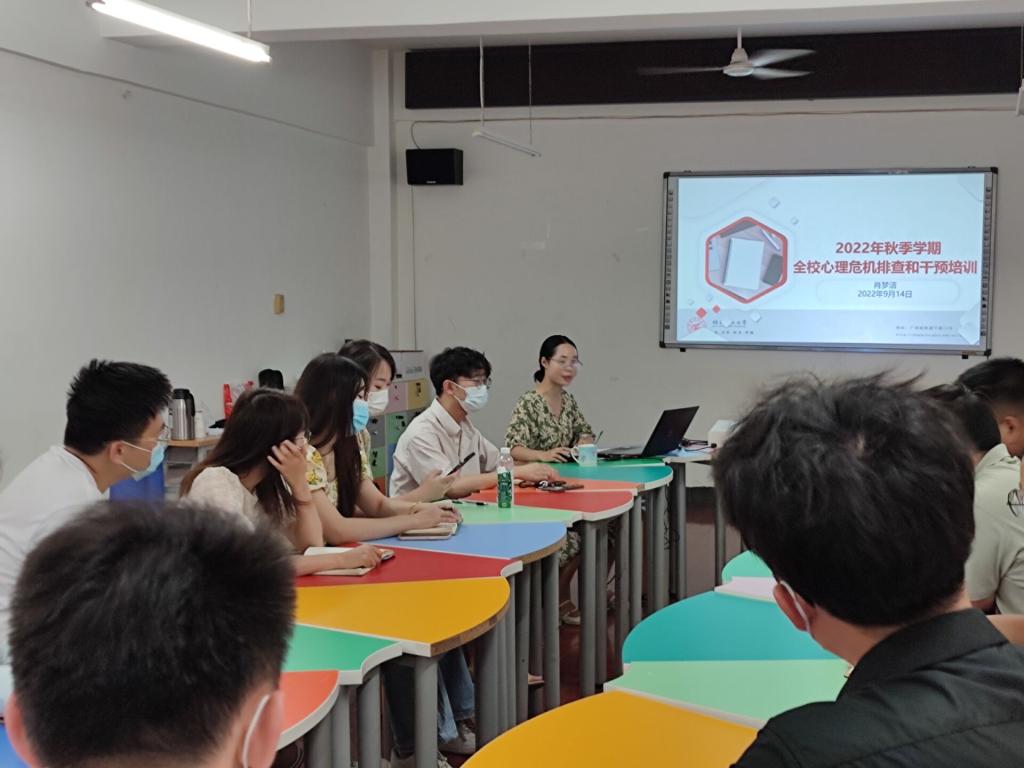 为贯彻落实《自治区教育厅关于做好2022年秋季学期开学初大学生心理危机排查和干预工作的通知》(桂教思政〔2022〕21号)的文件精神,确保我校的安全稳定,9月14日上午,学校心理健康教育与咨询中心在心理中心B403召开了秋季学期开学初全校心理危机排查和干预培训会。本次培训由心理健康教育与咨询中心肖梦洁老师主讲,各学院负责心理健康教育工作的辅导员参加了会议,广西高校“心理健康教育互助共建大行动”英国上市公司365工作组各高校多名心理健康教育教师以线上、线下的形式参加了活动。