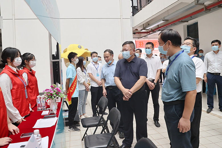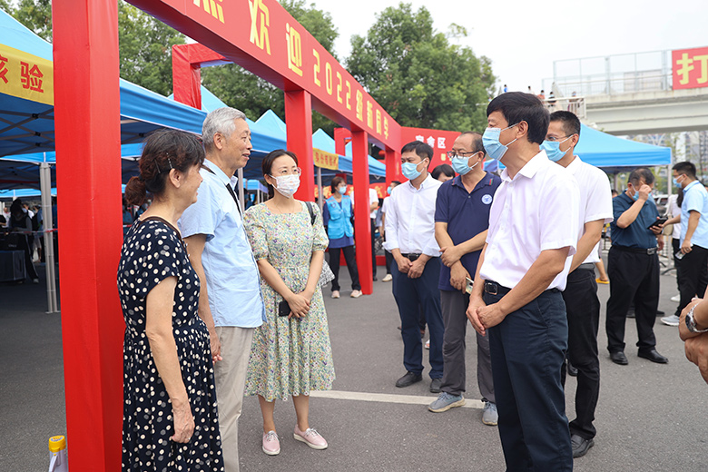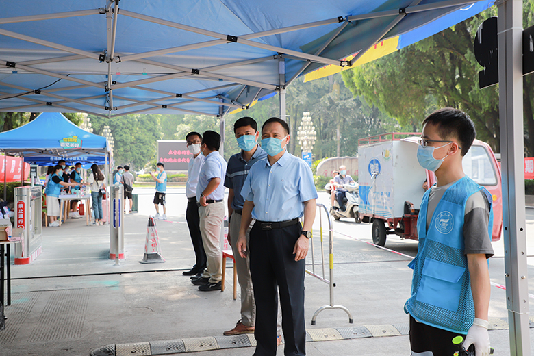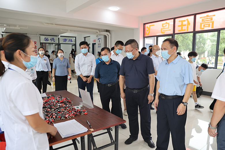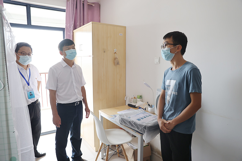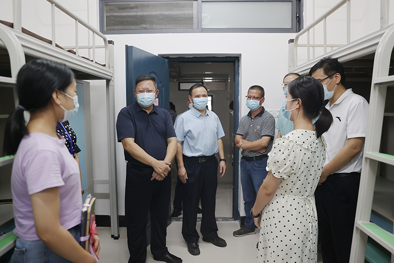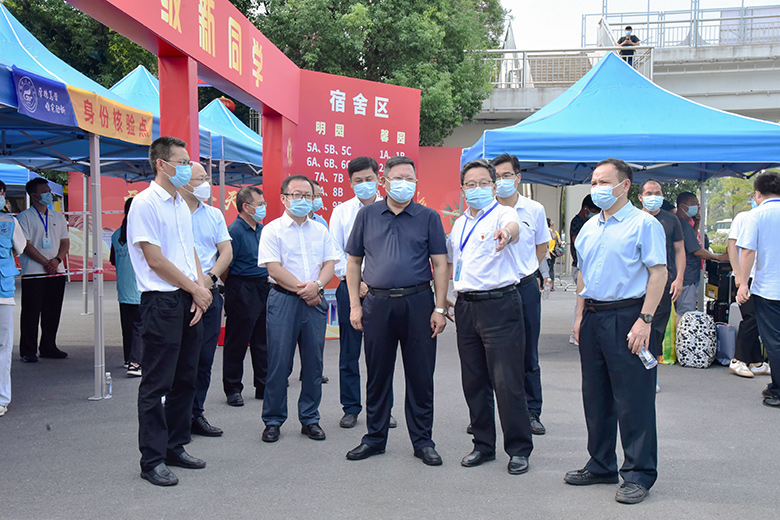邓军率队前往雁山校区新生报到点、学生宿舍及部分学院迎新点开展实地检查指导。在东门报到入口,邓军了解了新生入校流程和疫情防控要求下的各项报到举措,检查了新生入校身份核验环节,并对一线工作人员和学生志愿者的辛勤付出表示感谢。
