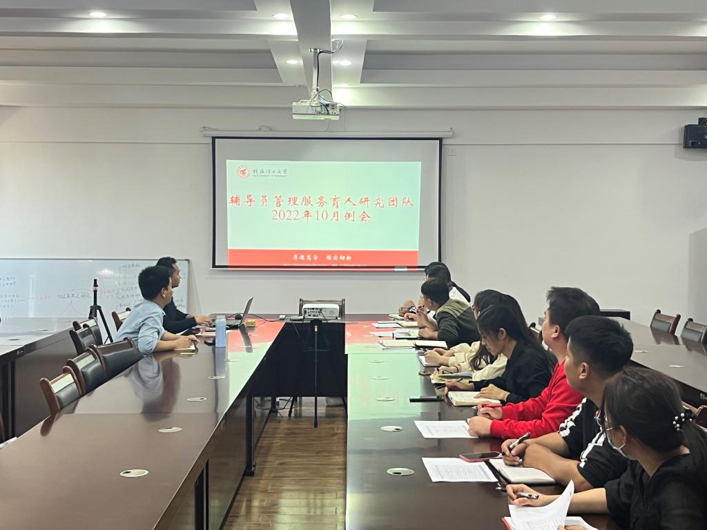 为提升管理服务育人研究团队成员的科研能力,10月14日中午,辅导员管理服务育人团队在雁山校区12407召开2022年秋季学期10月工作例会,会议由团队负责人环境科学与工程学院党委副书记郝文佳主持。