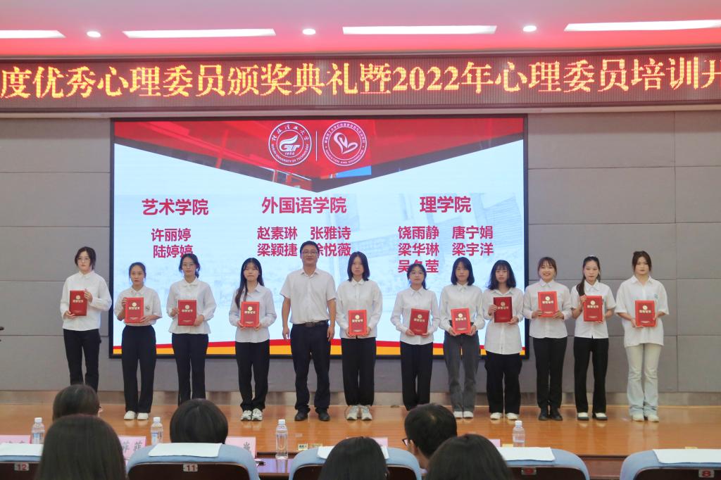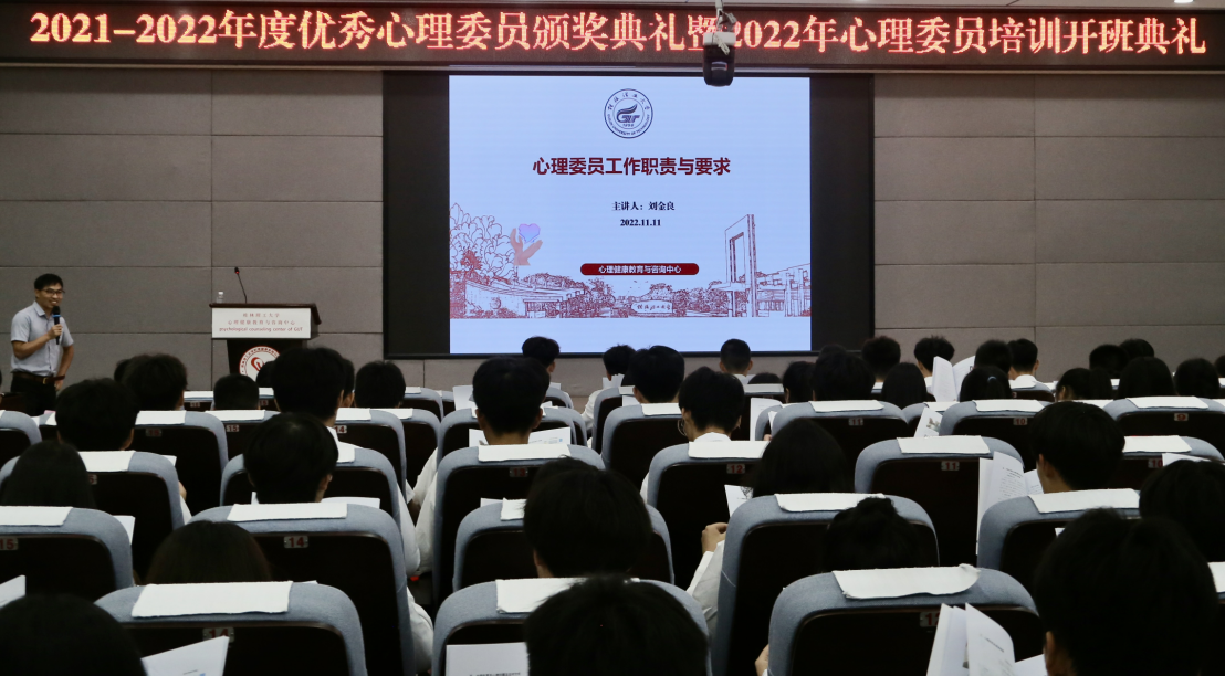为了进一步加强心理委员队伍建设,充分发挥心理委员在我校大学生心理健康教育工作中的作用。11月11日,我校心理健康教育与咨询中心在雁山校区教1栋501举行2021—2022学年优秀心理委员表彰大会暨2022年心理委员培训开班典礼。学生工作部(处)副部(处)长孙巍,商学院党委副书记沈菲菲,化学与生物工程学院党委副书记李少华,心理健康教育与咨询中心全体教师,各学院负责心理专项工作的辅导员,2021-2022学年优秀心理委员及2022级全体心理委员参加了本次活动。