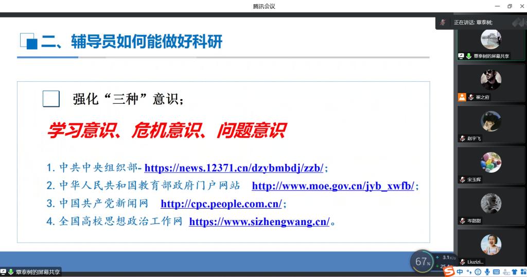 会上,团队成员汇报了下半年的科研计划,随后,商学院辅导员覃泰树为大家作题为《辅导员科研心路历程分享》科研提升培训。他从辅导员为什么要做科研,辅导员如何能做好科研两个方面为大家进行培训,他强调无论从国家层面、学校层面还是个人层面,都要求我们义不容辞的做好科研,要有教师的知识、外交官的口才、文员的文笔,在做科研过程中,要养成学习意识、危机意识、问题意识。他希望各位老师要在平时的工作中认真思考、高度凝练,找到符合自己发展的道路