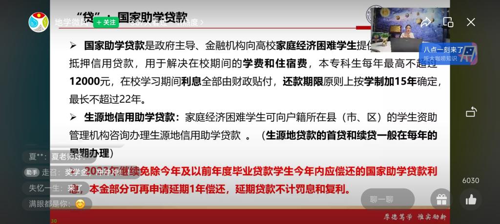 本次活动通过学院微信视频号“GUT地学微风”进行直播,共分为四个环节。首先,师生家长共同观看地球科学学院宣传片,初步了解学院发展状况。其次,熊彬院长就专业前景、就业方向、考研情况进行深入讲解。线上家长认真倾听,积极互动,熊彬院长对家长们提出的问题进行了一一解答。随后,夏雪莲老师对高校学生资助政策及成效进行宣讲,从“奖贷助勤补免+绿色通道”多元混合资助政策、学校和学院发展型资助育人体系等方面介绍了资助工作概况和资助育人成效。最后,周密老师讲述了学生在校食宿、学习和校园文化活动情况,活动受到家长们的高度认可。