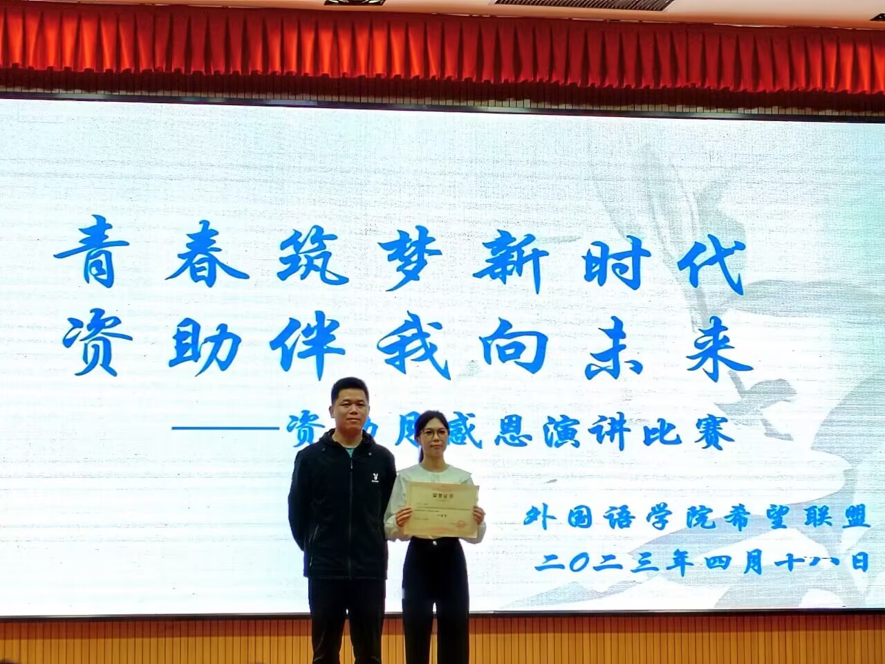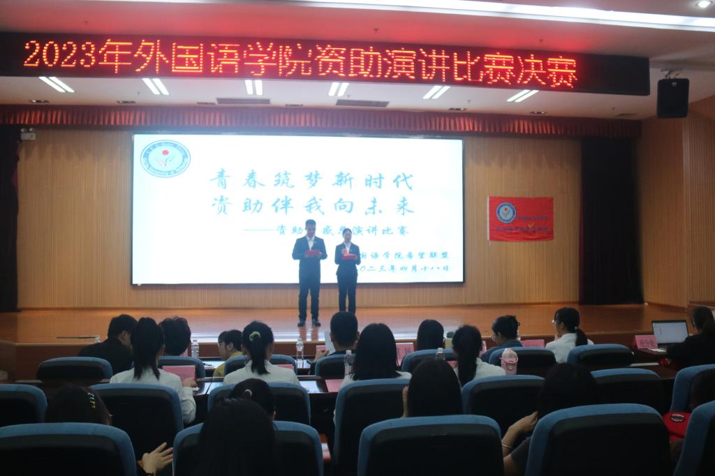 为进一步加强国家资助政策的宣传和普及,培养学生自立自强、励志感恩的品格,4月18日晚,外国语学院在雁山图书馆报告厅举行了“青春筑梦新时代,资助伴我向未来”资助主题演讲比赛。外国语学院团委书记舒强、学院20级辅导员李林军、英语教研室老师莫妍、周楠出席会议,200余名学生参加。