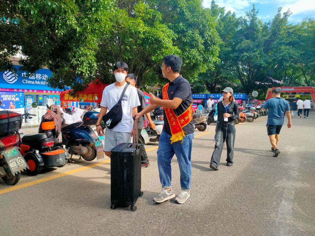 答疑惑,党员志愿者引导新生报到的同时,结合自身实际,与新生积极进行交流,耐心解答学生入校的疑惑,并给予学习、生活等方面的指导,同时提醒新生要提高安全防范意识,谨防网络诈骗。