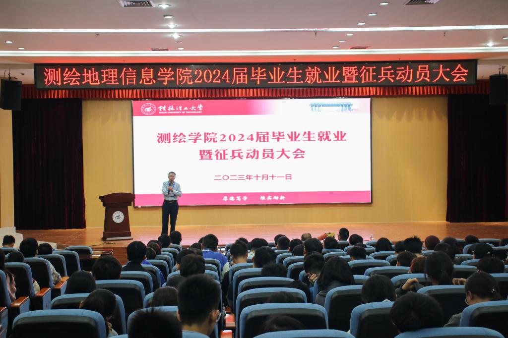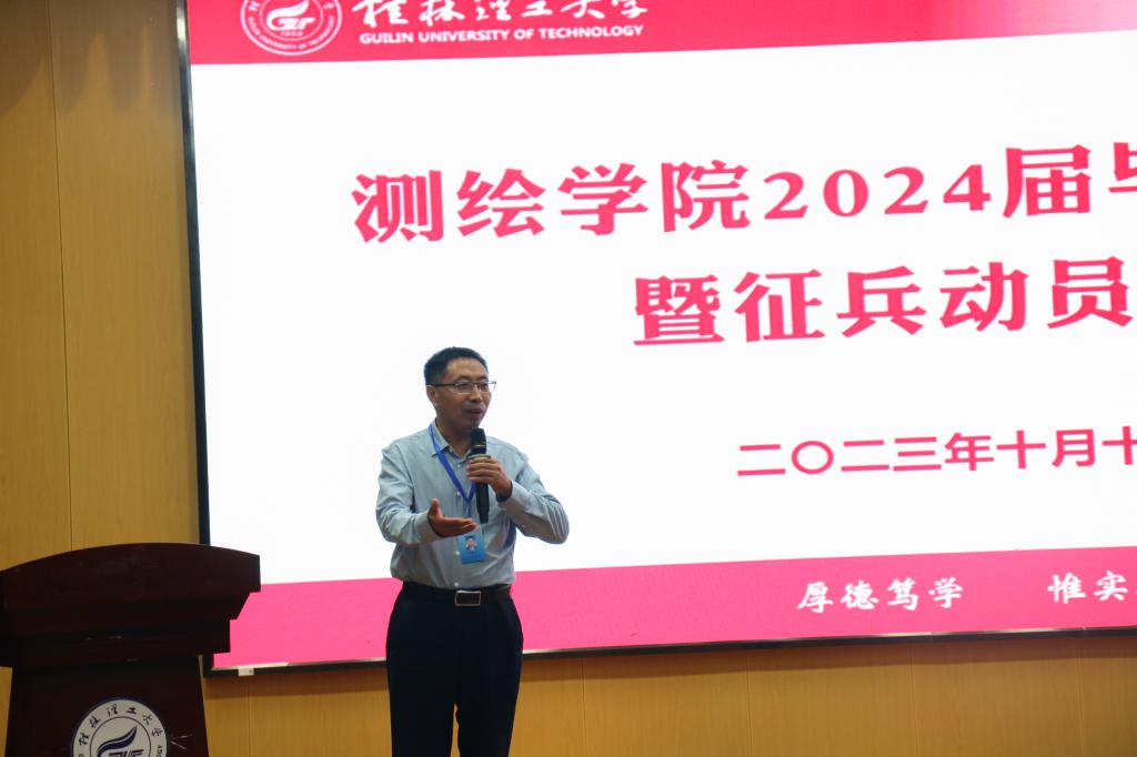 为深入贯彻落实党中央、国务院、教育部、自治区教育厅关于做好高校毕业生就业创业工作决策部署,加快推进2024届毕业生高质量充分就业,进一步加强征兵工作的动员力度,10月11日下午,测绘地理信息学院在雁山校区图书馆报告厅召开2024届本科毕业生就业暨征兵动员大会。学院党委书记李景文、学院院长刘立龙、学校武装部副部长黄海、学院团委书记徐嘉辉、地信教研室副主任姜建武、优秀本科毕业生代表及全体2024届毕业生参加了会议。