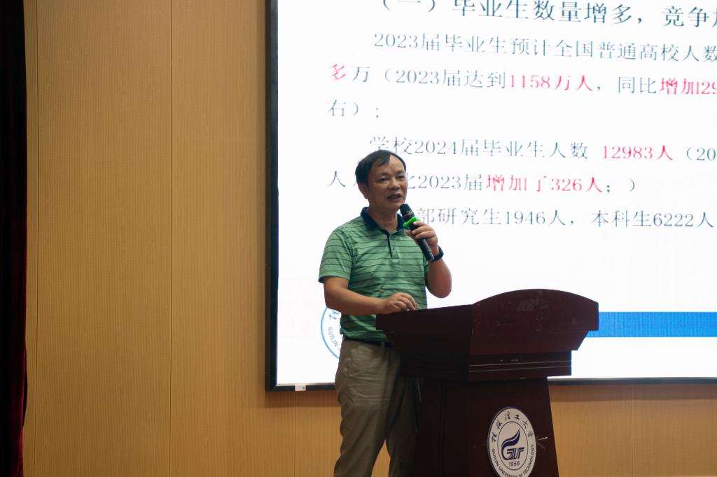 会上,学院院长刘立龙回顾了2023届毕业生就业考研情况,分析了2024届毕业生就业面临的机遇与挑战,同时积极引导毕业生转变就业观念,增强就业紧迫感,提高就业主动性。随后,学校武装部副部长黄海通过分享自己在军队的亲身经历,结合当前征兵工作的相关政策,号召广大毕业生响应国家征兵入伍号召,积极投身军营。接着,往届优秀毕业生代表吴宸龙、2024届优秀代表韦开兴分享了自己的求职择业经验,引导毕业生树立正确的就业观,鼓励大家主动出击,抓住“金九银十”的关键期。最后,学院党委书记李景文结合国家政策及学院近年来就业情况指出,每位同学都应积极主动谋划未来,有困难找学院,找老师,同时要找准目标,夯实基础。将自身发展主动融入党和国家发展之中,争做新时代中国特色社会主义德才兼备的建设者与创造者,为实现中华民族伟大复兴的中国梦贡献青年力量。