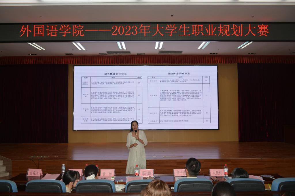 10月26日晚,2023年大学生职业规划大赛外国语学院决赛于我校雁山校区图书馆报告厅顺利举行。此次比赛邀请了学院党委副书记邓洁琼、地球科学学院辅导员董子盛、2020级辅导员李林军、2023级辅导员姚倩以及2022级兼职辅导员袁聂梅担任评委嘉宾,学院学生积极到场观赛。