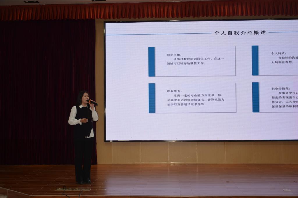 活动伊始,经过主持人上台介绍到场嘉宾、评委和比赛规则后,比赛正式拉开帷幕。首先,董子胜老师在开场辞中表达了对全体参赛选手的支持与鼓励,并预祝此次大赛取得圆满成功。随后,成长赛道的选手们逐一登台,结合社会实际情况和专业特色,分析个人能力、畅叙职业目标以及阐明实现路径,讲述自己的职业生涯规划。其次是就业赛道的选手们陈述个人求职意向、职业准备情况,以及展示通用素质和岗位能力、个人简历。在比赛过程中,选手们流畅自如地讲述和自信昂扬地回答评委提问的姿态深深的激励着在场的每一位观众。中场休息的互动小游戏更是将现场的气氛推至高潮。大赛尾声,邓洁琼老师针对大赛选手们的表现发表总结,与此同时还表达了对同学们的期盼。最后,主持人公布最终的比赛结果,并由评委们为获奖的参赛选手们颁奖并合影留念。至此精彩的比赛圆满结束。