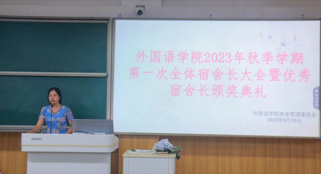 为能更好地开展学院宿舍工作,加强宿舍卫生及安全管理,外国语学院宿舍管理委员会于9月26日在05102召开本学期第一次全体宿舍长会议暨优秀宿舍长颁奖典礼。学院党委副书记邓洁琼老师出席会议,全体宿舍长到场参加。会议由2023级辅导员姚倩老师主持。