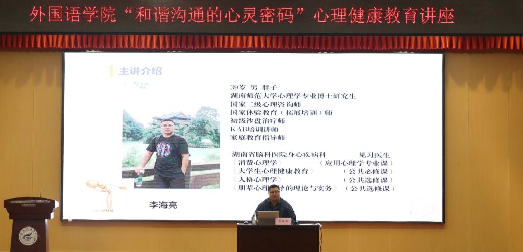 11月8日晚上七点,学院在雁山校区图书馆报告厅顺利举行和谐沟通的心灵密码——心理适应性教育专题讲座。本次讲座邀请我校心理健康教育教师李海亮主讲,学院辅导员姚倩老师、兼职辅导员袁聂梅老师和各年级本科生和研究生参加本次讲座,活动由王好男老师主持。