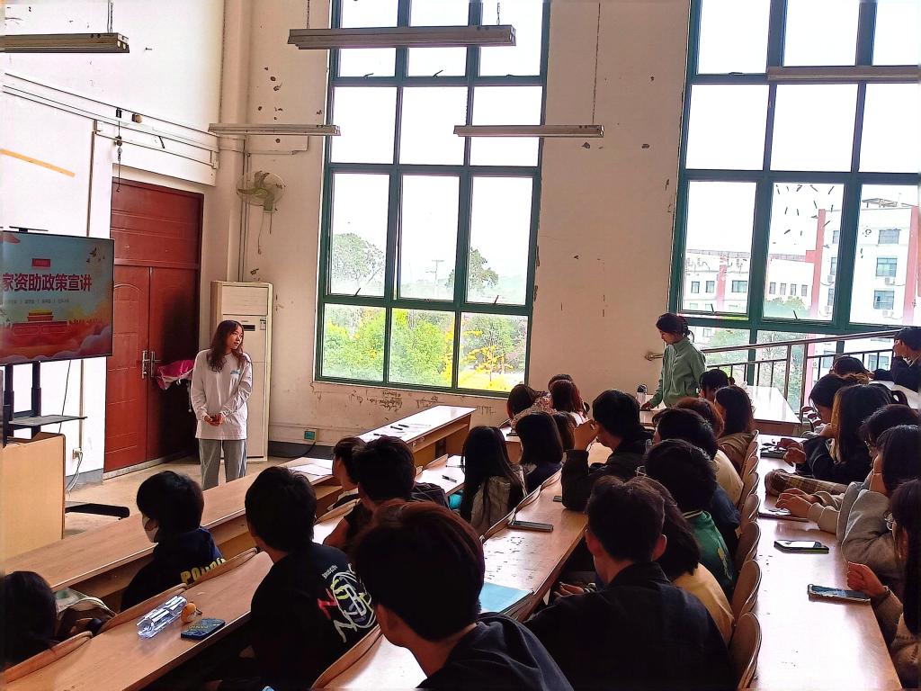 会上,周俊巧老师指出这些政策是为了帮助那些在生活上遇到困难的学生,帮助同学们更好地完成学业,实现人生价值。资助宣传大使农秋月详细地介绍了目前国家和学校的资助政策、资助体系,包括资助对象、资助条件、资助标准以及申请和发放的具体流程。她特别强调,这些政策不仅关注学生的经济状况,还重视学生的品德和学业表现。她和学生们分享其大学以来自己在资助政策的帮助下,心怀感恩,奋发上进,不断突破自我的真实故事。与同学们分享在奖学金评选中对绩点的要求,鼓励新生克服困难,努力学习,全面提升自己的综合素质,把自己培养成德、智、体、美全面发展的优秀人才。