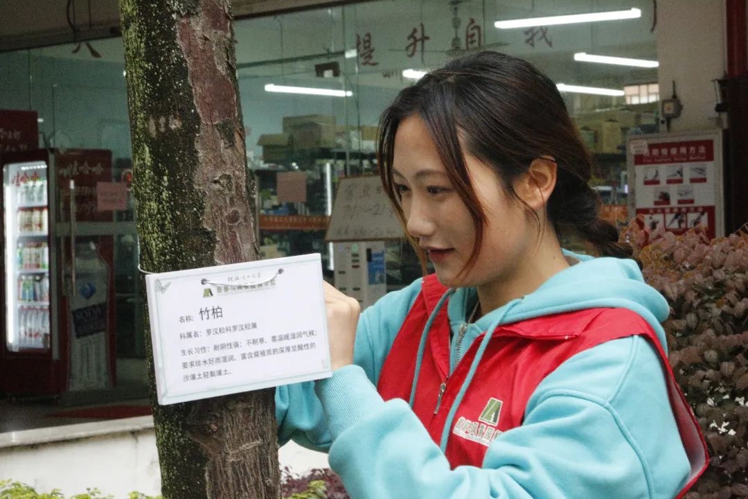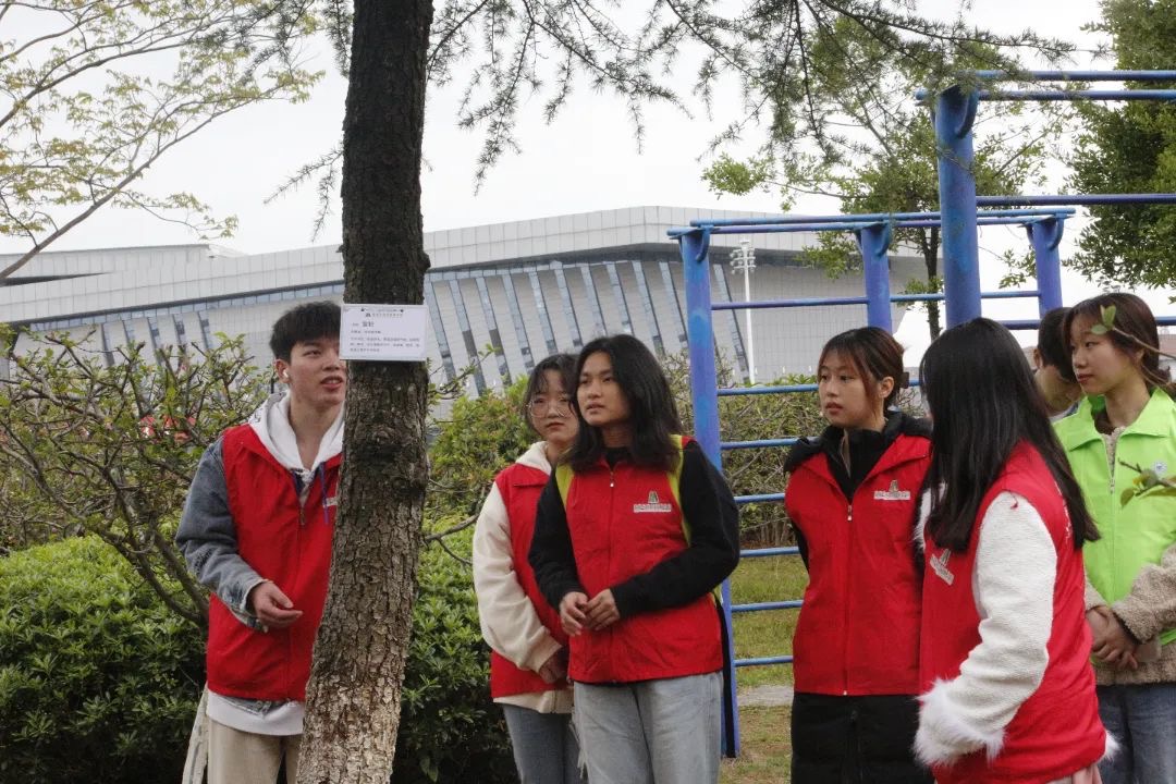 通过调研,志愿者们提前确认树木所在位置及树木的数量,从学校雁山校区二号食堂门口出发,沿着提前规划好的路线前进,利用铁丝、绳子等工具将写有植物类别、名称、科名、生长习性的牌子依次挂到不同种类树苗的树干上,让校园中的各类树木都有了详细的“身份信息”,让同学们在欣赏校园美景之余也能了解树木的习性及植物相关知识,激发师生呵护树苗,美化环境的意识。