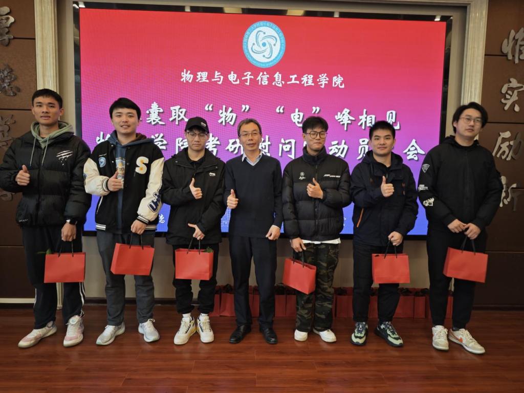 在2024年全国硕士研究生招生考试开考之际,为鼓舞学院考研学子士气,缓解压力,轻松应考,12月19日上午,物理与电子信息工程学院在02507会议室举办学院2024年全国硕士研究生招生考试慰问暨动员大会。学院党委书记秦勤忠、学院副院长(主持工作)董明刚、学院党委副书记蒋琼、学院副院长张富文、学院毕业班辅导员以及2020级考研学子代表参加了会议。会议由学院党委副书记蒋琼主持。