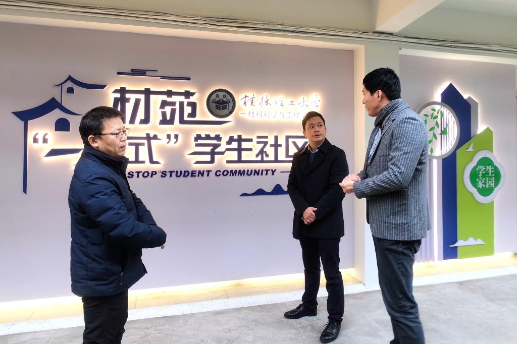 邓炼、雷绍湖一行对材苑“一站式”学生社区服务学生的重要作用和现阶段取得的成绩给予肯定,强调材苑“一站式”学生社区的建设要秉持“共建、共治、共享”的理念,努力打造具有桂工特色、体现“三全育人”“五育并举”要求、贴近学生实际的新时代“一站式”学生社区;要把学生社区打造成“党建和思想政治工作的高地、培养人才的园地、管理服务学生的基地,维护校园安全稳定的阵地”,保质量、严要求、高效率地推进学生社区建设,助力学校人才培养建设;要基于学生现实所需,不断提升“一站式”学生社区服务学生的功能,坚持和发展好新时代“枫桥经验”,努力打造智慧服务创新基地。