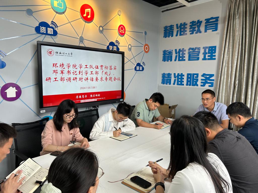 5月8日下午,环境科学与工程学院在12408大数据工作室召开贯彻落实邓军书记到学工部(处)、研工部调研时讲话要求专题会议,学院党委副书记叶大相出席会议,全体专兼职辅导员参加会议,会议由叶大相主持。
