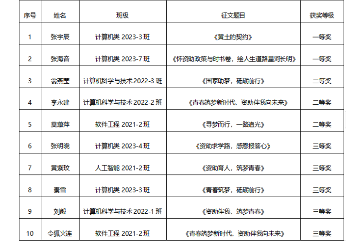 自比赛启动以来,收到了来自计算机科学与工程学院各年级学生的踊跃投稿,同学们的参与热情高涨,每一篇作品都蕴含了同学们的真挚情感和深刻思考,从中我们能感受到学生对国家资助政策的深切体会与由衷感激。经过计算机科学与工程学院评委老师的细致评审,最终评选出了一批优秀的作品。其中一等奖2名,二等奖3名,三等奖5名。