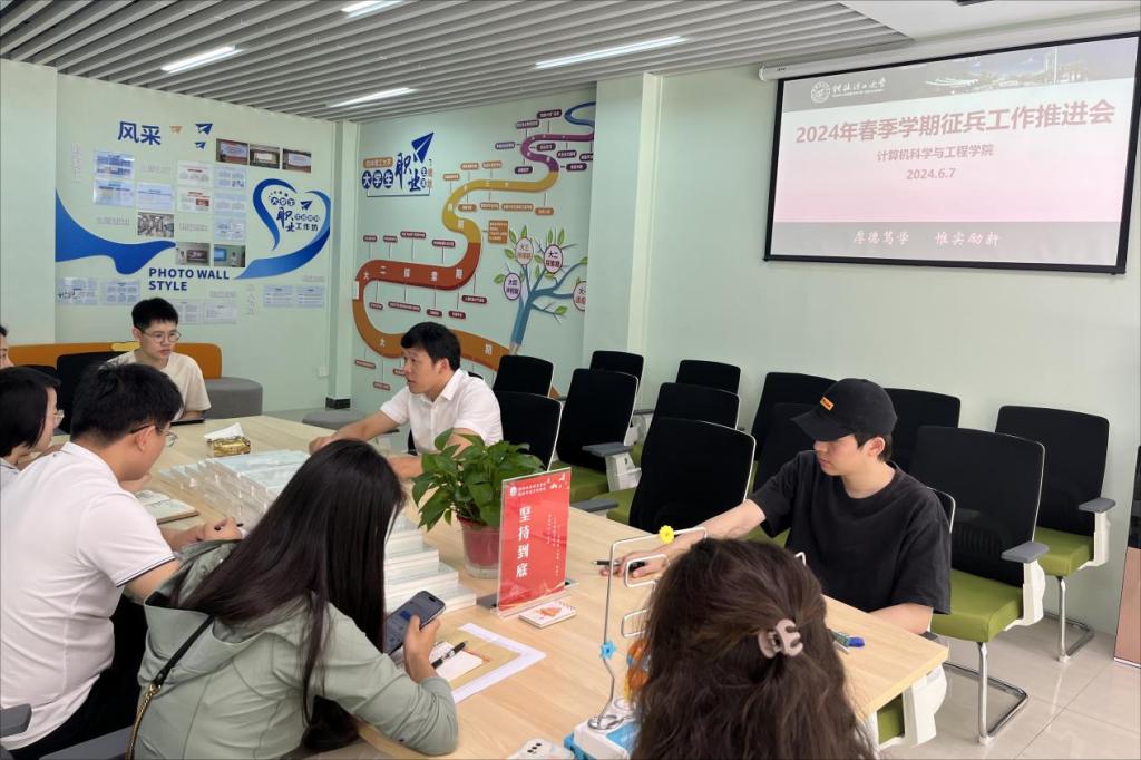 为进一步激发大学生参军报国热情,计算机科学与工程学院于6月7日在19栋“嘉园”一站式学生社区召开了2024年春季学期征兵工作推进会。本次会议旨在全面部署学院征兵工作,动员广大学生积极响应国家号召,投身国防事业。会议由计算机科学与工程学院党委副书记黎超业主持,各年级辅导员参加会议。