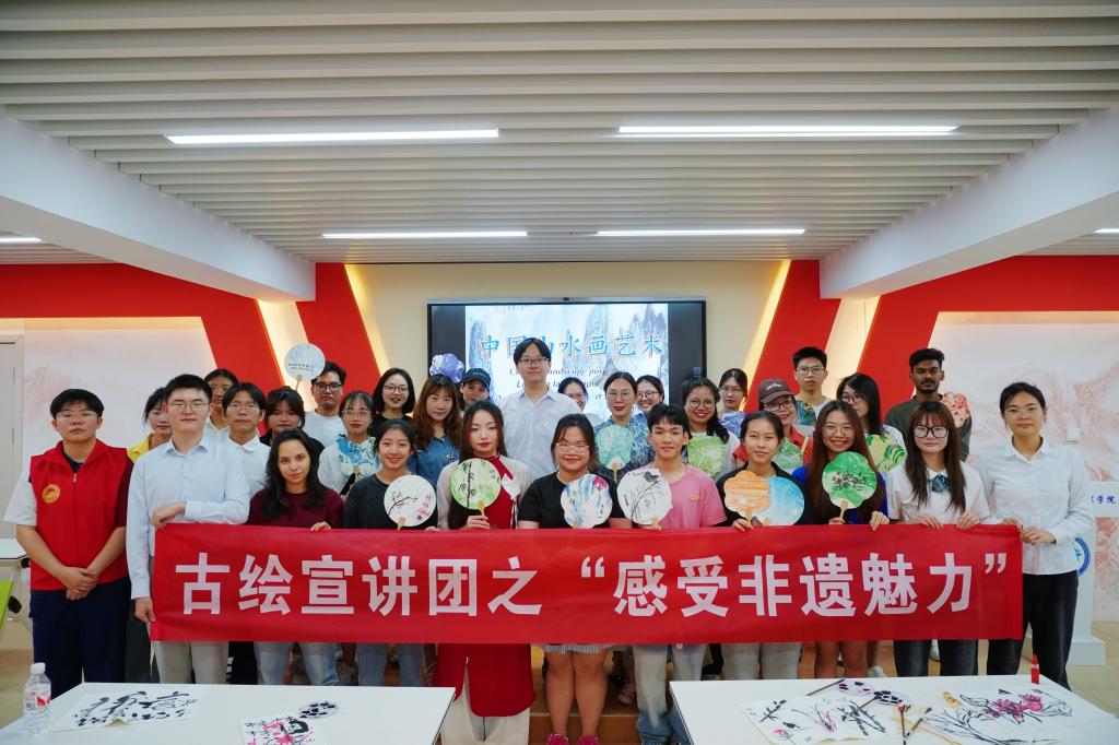 古绘宣讲团讲解员赵晨健同学首先围绕中国山水画的历史背景、艺术特点和形式美感等方面对中国山水画的悠久历史和深厚底蕴进行了生动讲解,让在场师生对中国画的艺术特色有了更加直观的认识。随后,讲解员通过现场演示,从形神、笔墨、色彩和形制四个方面详细讲述了中国山水画的精髓,让同学们对中国山水画的艺术语言和审美价值有了更深层次的理解。随后,现场的留学生们在老师的指导下动手尝试毛笔书写与绘画,从简单的线条练习到构图创作,体验到了中国书法的韵味与绘画的乐趣。漆扇制作环节将活动推向了高潮,留学生们争先参与漆扇制作,绘制属于自己的漆扇,在扇面写下期望与祝福。师生们纷纷表示,这是一次令人难忘的文化体验活动,希望未来能有更多这样的文化交流机会,增进对中华文化的了解和认同。
