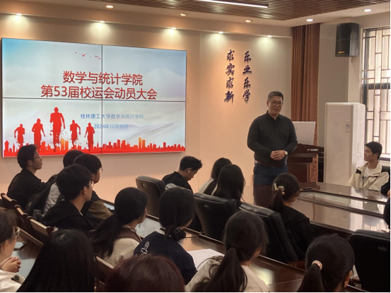 为激励运动员们以最佳状态迎接即将到来的第53届校运会,2024年10月30日,数学与统计学院在雁山校区08201会议室召开了第53届校运会动员大会。学院党委副书记钟立军、团委副书记彭娇娇出席,全体参赛运动员参加了此次会议。