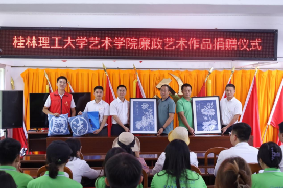 “人生就像素布一样,只有'扎紧'廉洁底线,才能在历经千染万洗后仍葆廉洁底色。”为加强清廉学院建设,将廉洁文化融入乡村,活动当天,学院在灌阳镇大源村隆重举行了廉洁艺术作品捐赠仪式。仪式上,由学院师生精心创作的廉政主题扎染作品、剪纸及背包被送到了当地干部群众手中,大家现场交流了廉洁作品的创作意义。此外,学院“探乡里发展,镜头映富兴”实践团成员还积极对接乡村文化发展建设需求,绘制文化长廊和墙绘,并开展寻找良好家风家训访谈活动,将绿色发展、生态宜居、乡风文明理念深深植入人心。