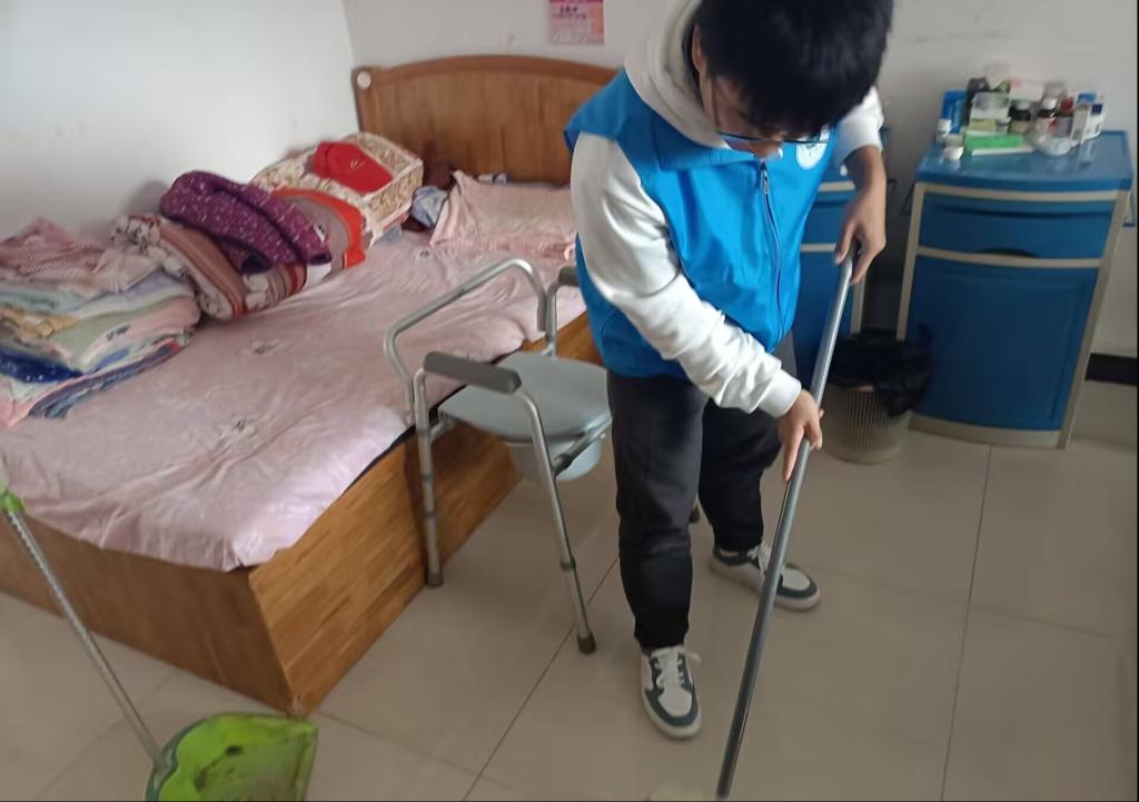 表演结束后,志愿者们倾听老人讲述过去的故事,了解他们内心,倾听他们心声,自己也在历史故事中获取成长成才的宝贵经验。同时,部分志愿者负责打扫房间,用行动表达对老人们的关爱。他们认真清扫地面、擦拭桌椅、整理床铺。房间经整理后整洁有序,老人们回来看到后,连声道谢,脸上洋溢着笑容。