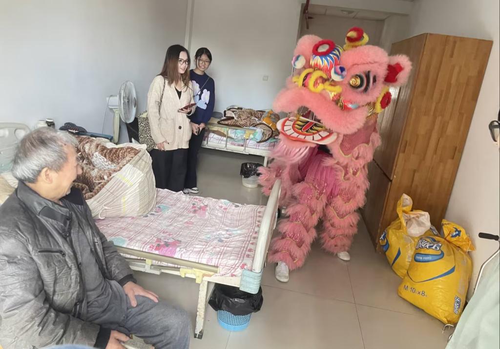 志愿者们给老人表演舞狮
