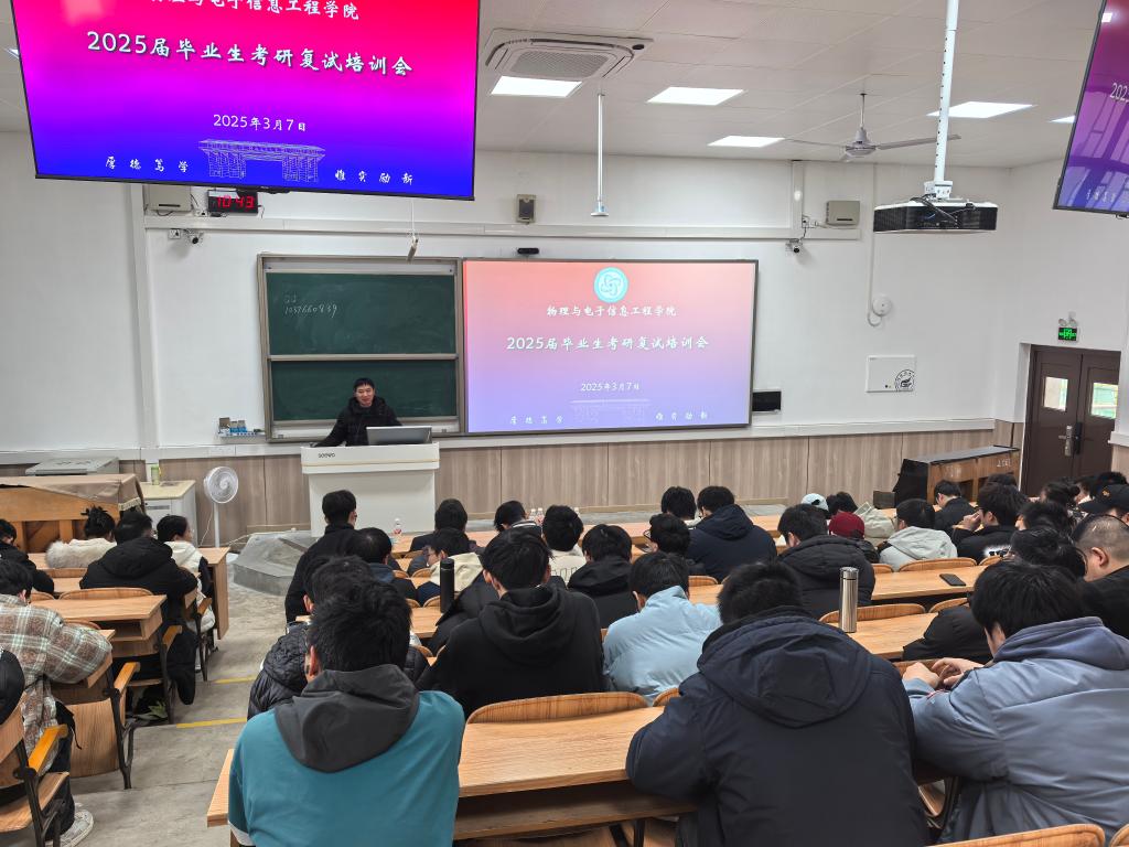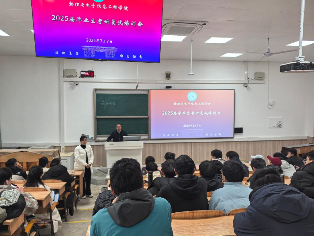 2025年3月7日上午,物理与电子信息工程学院在雁山校区07518教室顺利举行了2025届毕业生考研复试培训会。物理与电子信息工程学院院长董明刚、副院长张富文为80余位即将参加考研复试的学子进行了专题培训,物电学院党委副书记蒋琼主持了本次培训会。