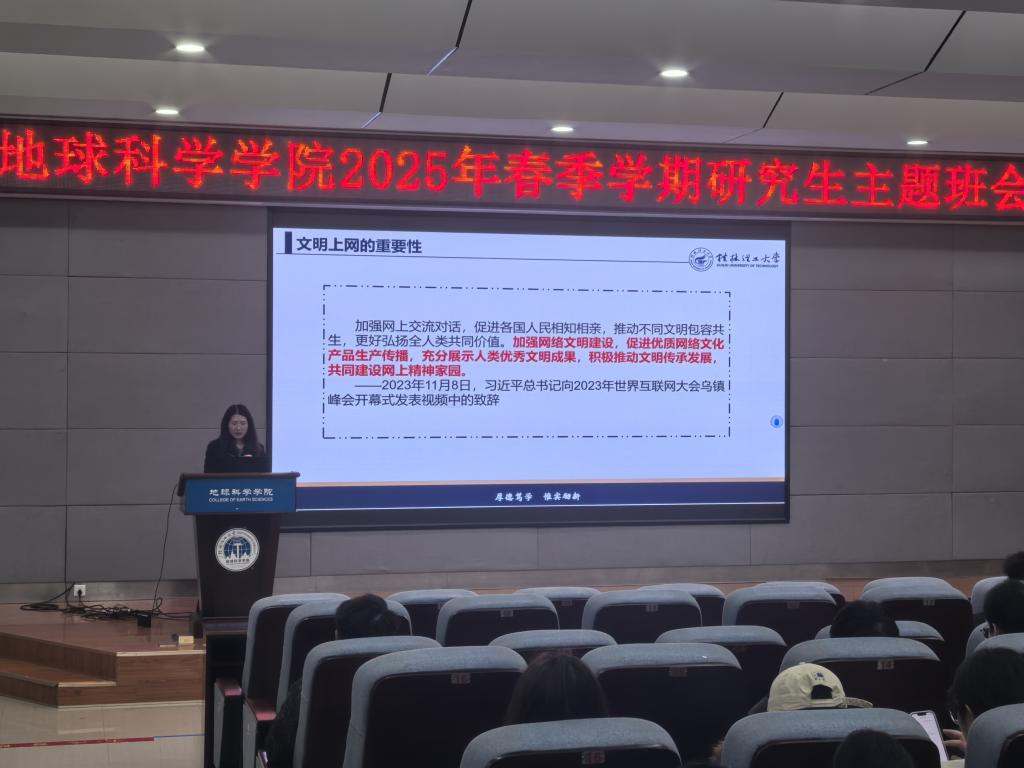 为提升学生网络文明素养,营造安全健康的网络环境,新学期,地球科学学院各班级组织召开了文明上网主题班会。此次主题班会由各专业班级班主任、各年级辅导员及各研究生导师联合开展,覆盖地球科学学院全体本科生及研究生。