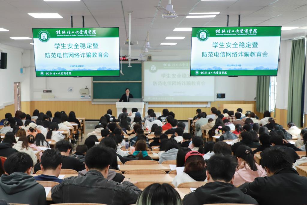 为进一步筑牢校园安全防线,提升学生反诈防骗能力,2025年4月3日,商学院在雁山校区召开学生安全稳定暨防范电信网络诈骗教育会。学院党委书记白凌婷,党委副书记、纪委书记饶蠡出席会议,辅导员及雁山校区全体学生党员、班长、团支书、安全委员、心理委员、宿舍长参加会议。
