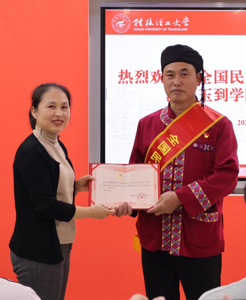 此次讲座特别邀请到2024年“全国民族团结进步模范个人”、桂林市龙脊镇大寨村原村委主任、党支部书记潘保玉同志,为同学们带来主题为《石榴花开映初心,团结路上写担当——全国民族团结进步模范个人潘保玉的民族团结实践之路》的精彩分享。