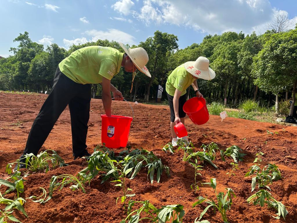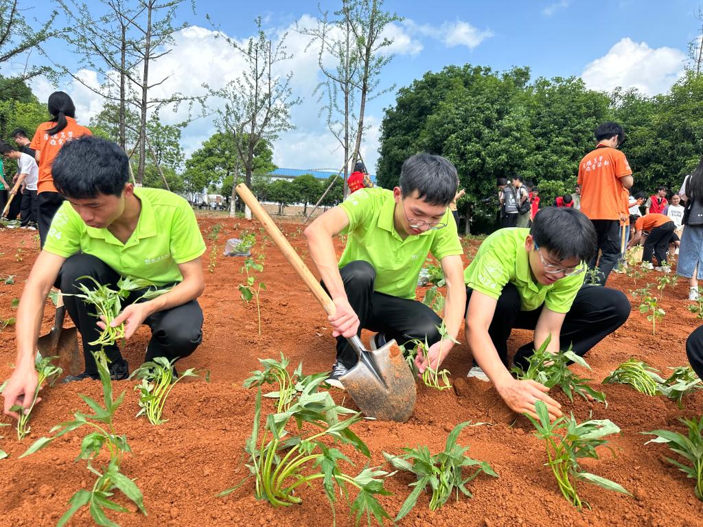 平整土地、筛选碎石、敲碎土块,翻土开畦......现场学生手持锄头、铁锹等农具,在年级辅导员谢基柱的指导下,分组投入翻土、除草、碎土、平整土地等工作中,为后续种植蔬菜、水果做好田垄规划。同学们几人一组,弯腰弓背,用锄头将松散的泥土堆砌成整齐的田垄,移栽农作物时,学生们根据不同作物的特性细心掘土胶水,顺利完成辣椒,茄子,红薯,苦瓜等品种的种植。大家在泥土的芬芳中体会“一粥一饭,当思来之不易”的深意,更在躬身实践中感悟“民生在勤,勤则不匮”的传统农耕文化内涵。