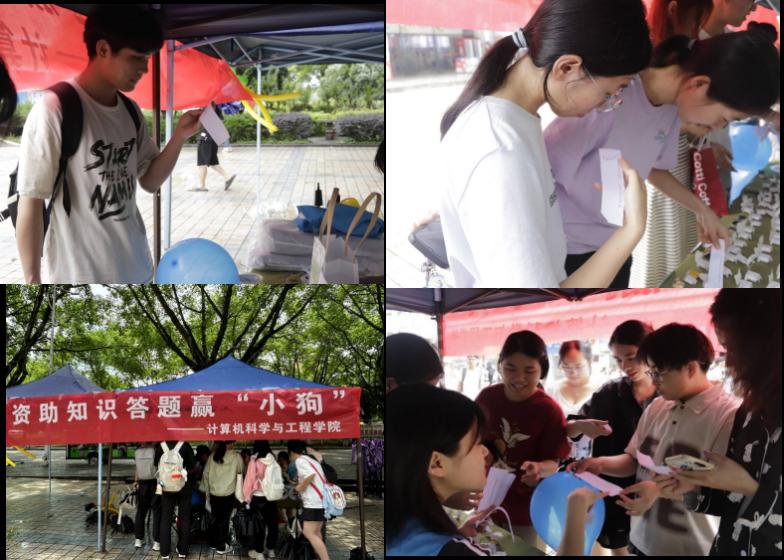 为深化国家资助政策宣传,推动资助知识学习与趣味活动有机融合,5月16日,计算机科学与工程学院于一号食堂门口顺利开展资助育人文化节之“答题赢‘小狗’,等你来挑战!”主题活动。本次活动由学院奋斗社策划组织,面向全校学生开放参与。