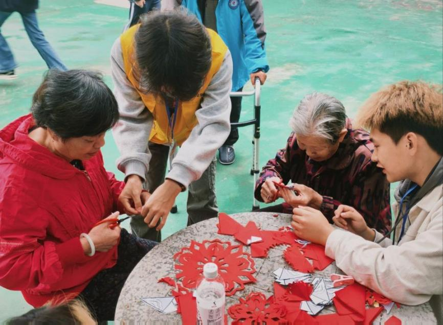 活动中,志愿者们携带食材与工具,与老人们一起包饺子、写春联、剪窗花、聊家常。现场分工有序、暖意融融:同学们剁馅、擀皮、包饺子一气呵成,一个个饱满的饺子承载着满满心意;写对联、剪窗花区域墨香氤氲、笑语盈盈,一幅幅笔力遒劲的春联、一张张寓意吉祥的剪纸,传递着对老人们的美好祝福。