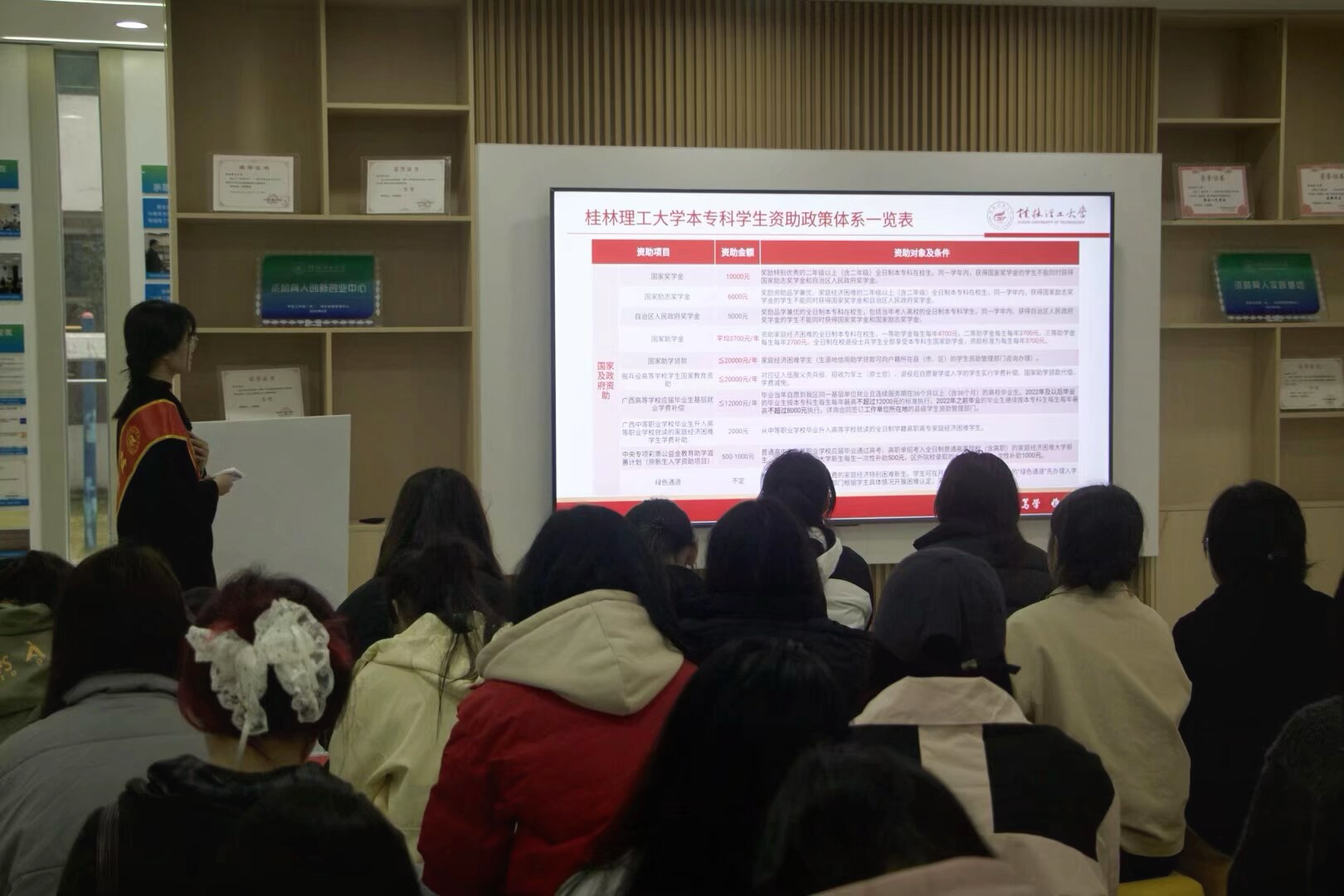 随后进行政策宣讲。韦彩金围绕《高校本专科学生资助政策简介》,图文并茂地解读了奖学金、助学金、助学贷款等的申请条件与流程,介绍了勤工助学、临时困难补助等相关内容,并结合案例说明各类资助的适用场景。互动环节中,她针对贷款还款、勤工岗位申请等实际问题一一解答,现场气氛热烈。